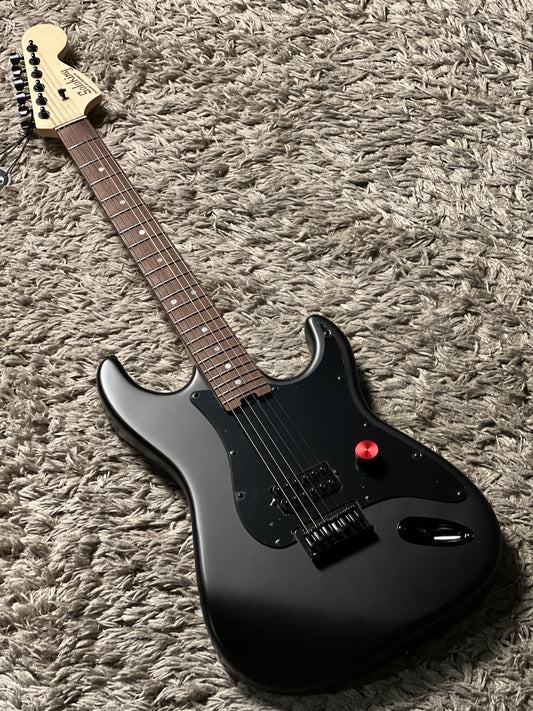 With Satin Black finish and matching painted headstock and red lining, with full black hardware.