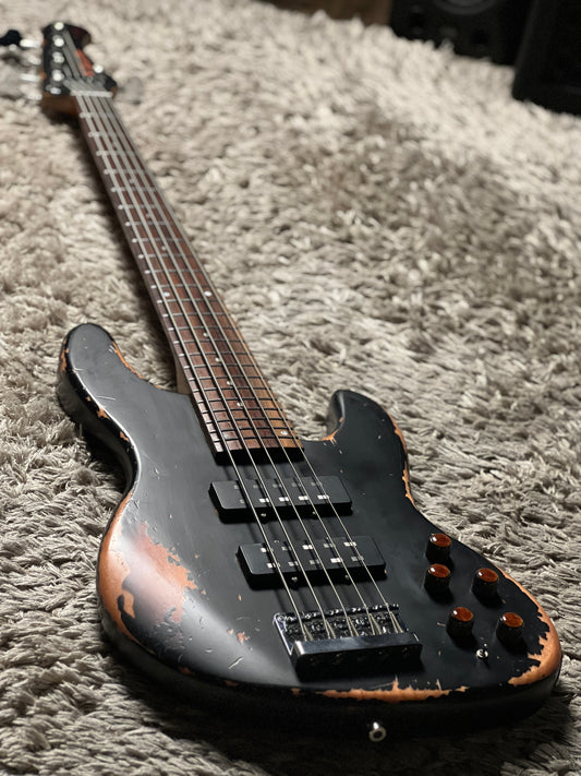 Dhatarattha Custom DEB HH 5 String Bass in Black Over Sunburst with RW FB and Nitrocellulose Lacquer Relic
