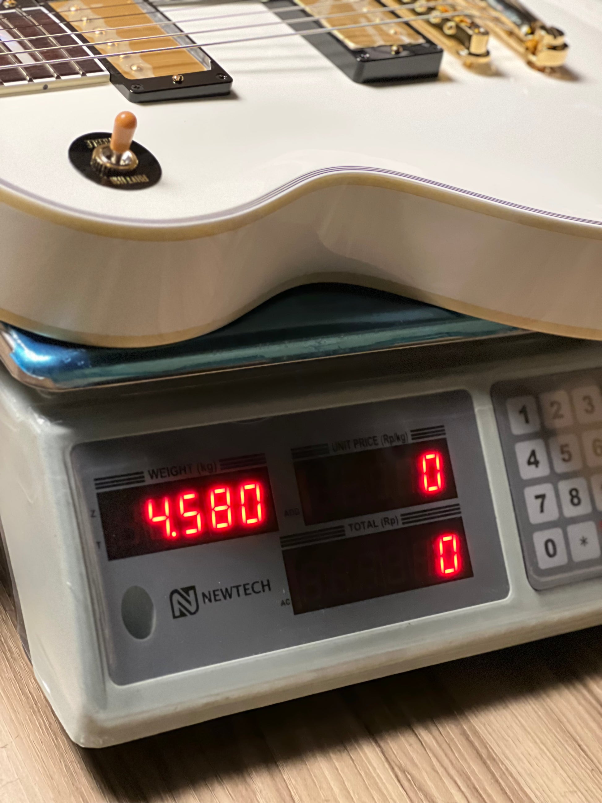 This model has a stylish white gloss finish, block pearl inlays, custom headstock, 4-ply pickguard and gold hardware.