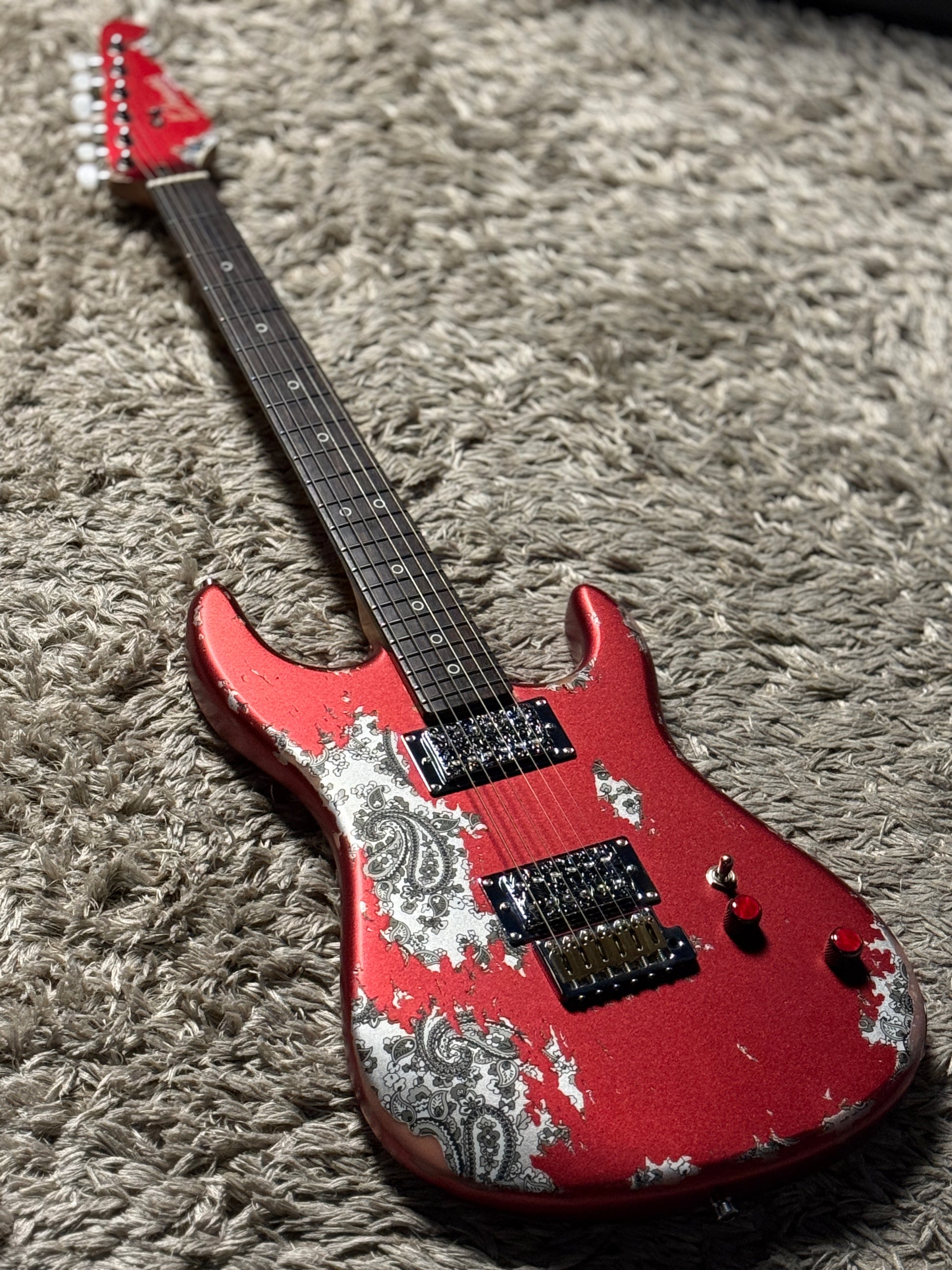 Dhatarattha Performance DST HH in Candy Apple Red over Black Paisley with RW FB and Nitrocellulose Lacquer Relic
