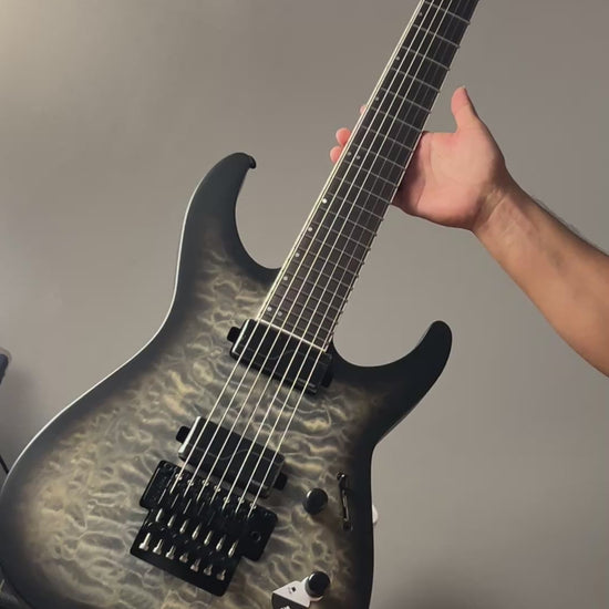 For those of you who like to explore the depths of extended range tunings, the LTD Deluxe M-1007 Baritone is a big contender for your next guitar. Offering set-thru construction for unobstructed access to the highest frets, the M-1007 baritone is a seven-string guitar built at a full 27" baritone scale, allowing for extreme downtuning while maintaining excellent string tension. It offers a comfortable and resonant alder body with an outstanding quilted maple top, and an extra-thin u-shaped three-piece maple neck. It has a bound Macassar ebony fingerboard with offset mother-of-pearl dot inlays and 24 extra-jumbo stainless steel frets, and a bound matching-finish reverse headstock. Components on the M-1007 Baritone include a Floyd Rose 1000 SE double-locking tremolo with stainless steel screws and precise Grover tuners. Its sound is powered by a set of direct-mounted Fishman Fluence Modern Humbucker active pickups (ceramic in the bridge and alnico in the neck), with push-pull control to select voicings and black nickel covers to match this guitar's outstanding aesthetics. Each pickup offers two voices. With the ceramic bridge pickup, Voice 1 is the ultimate high-output ceramic humbucker bridge pickup tone… crisp, searing crunch, tight bass with no mud, and a growl. Voice 2 delivers modern passive attack performance that has superbly organic distortion characteristics with outstanding dynamics and response. The alnico neck pickup's Voice 1 is Fishman's modern active high-output tone, offering the ideal active alnico sound: full, round, and boosted, but with unprecedented articulation and dynamics. Voice 2 gives you the crisp, clean and fluid neck humbucker tone you've always wanted.