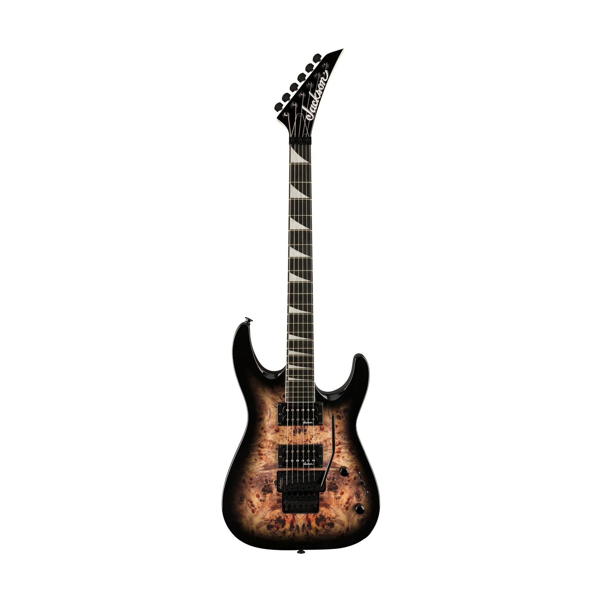 Dual Jackson high-output humbucking pickups with ceramic magnets erupt with hot, crunchy tone perfect for any flavor of hard rock or heavy metal. Dial in tone to your preference with three-way blade switching and single volume and tone controls, and wail away at will as the Jackson-branded Floyd Rose® licensed double-locking bridge provides dynamic trem action with tuning stability.