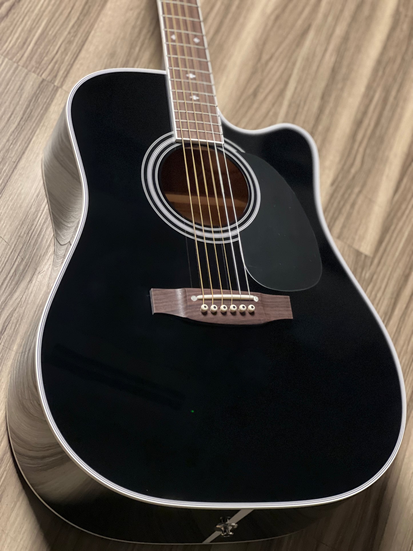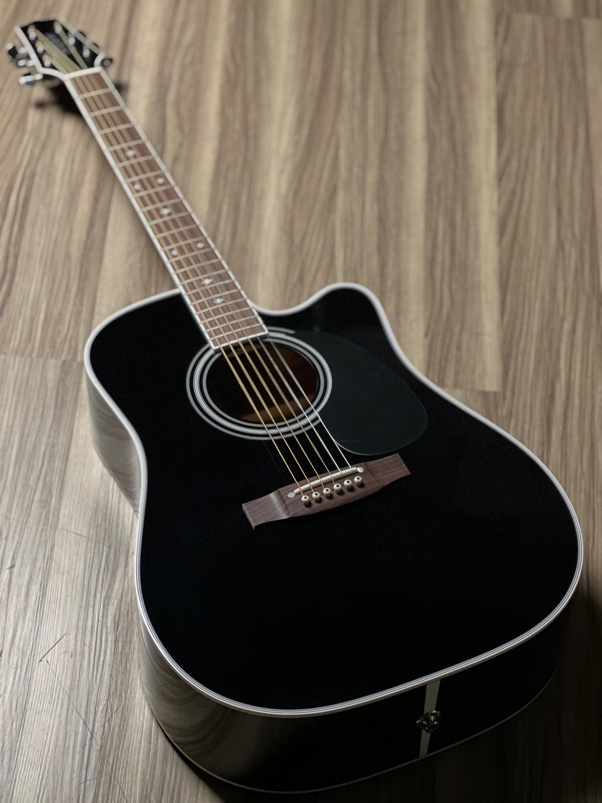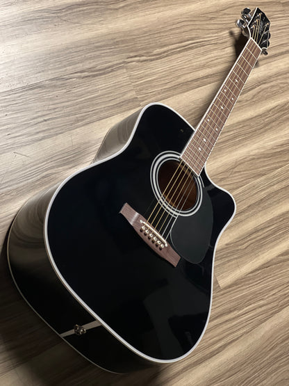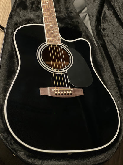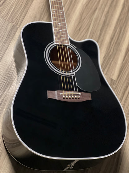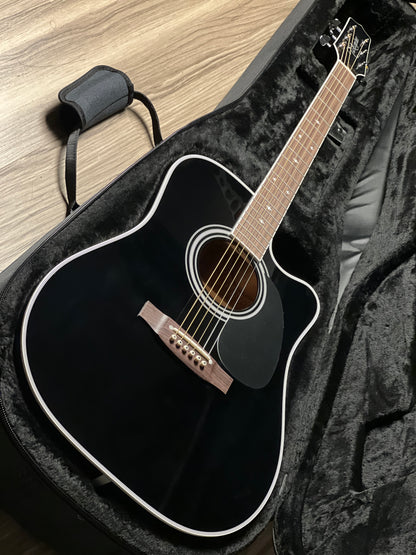 This guitar has been the choice of pro musicians of all genres. The versatility of this guitar begins with its solid cedar top that can play sweet mellow passages or power chords with equal ability. The maple back and sides are a perfect reflector for the tone generated by the soundboard and the gloss black finish looks great under the stage lights. The mahogany neck is joined to the body with a traditional, ultra strong dovetail joint.